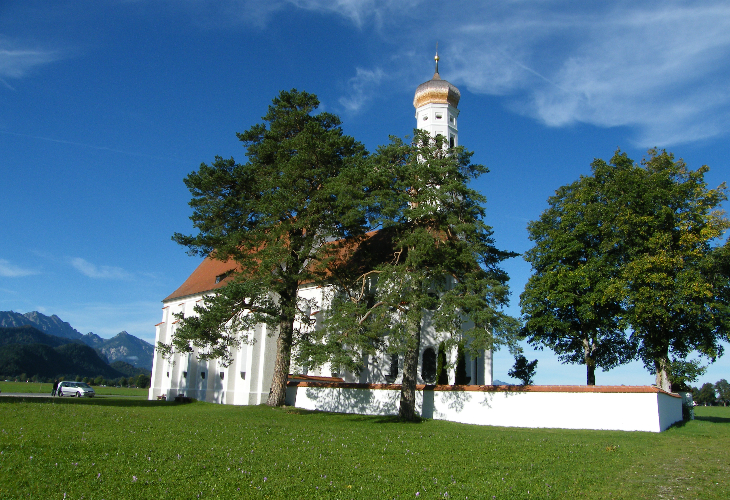 ノイシュヴァンシュタイン城の近くの草原の中にあるコロマン教会。写真スポットとして話題沸騰中のコロマン教会で、写真ストップの時間をお取りします。壮大な草原の中にぽつんと佇むコロマン教会でSNS映えの一枚を!お天気が良ければ、遠くにノイシュバンシュタイン城を眺めることができます。