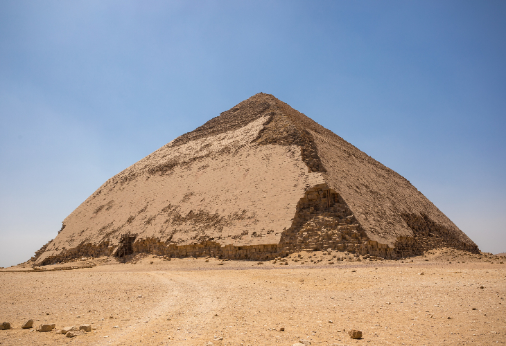 屈折ピラミッドは、技術的な問題のために現在の形状となっています。赤いピラミッドと同じくクフ王の父スネフェルによって建てられました。表面の化粧岩がよく残っています。