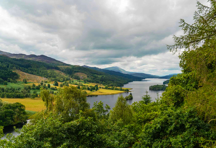 ハイランド・パースシャーの山々を抜け、トゥモール湖を見渡せるクイーンズ・ビューへ。