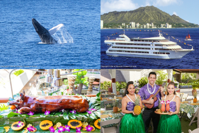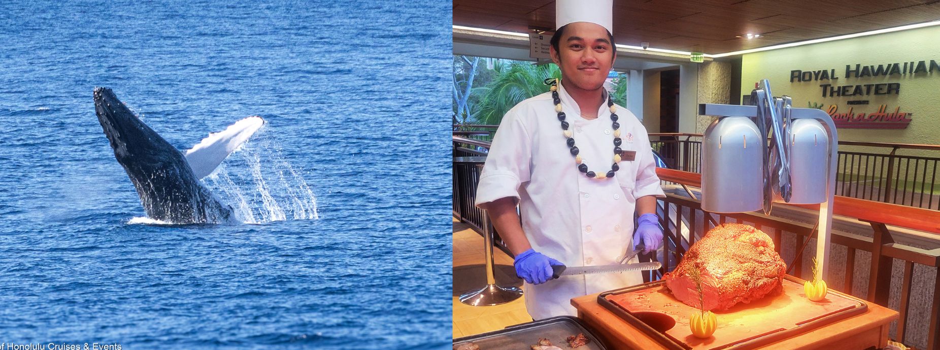 ハワイの冬だけの人気体験「ホエールウォッチング」と「ルアウ・ビュッフェ」をセットで楽しめるお得なコンボプランです。