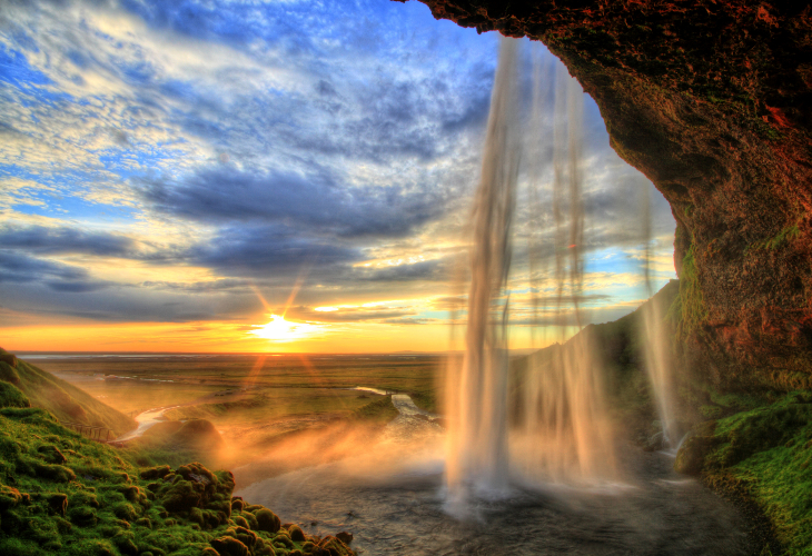 高さ60メートルの「セリャランズフォスの滝」は、裏側を歩けることで有名です。なかなか見ることのできない裏側からの光景をお楽しみください。