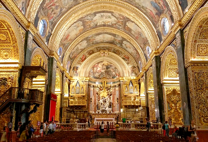 内部は豪華な装飾で飾られた聖ヨハネ大聖堂。カラバッジョの絵が収められていることで有名。