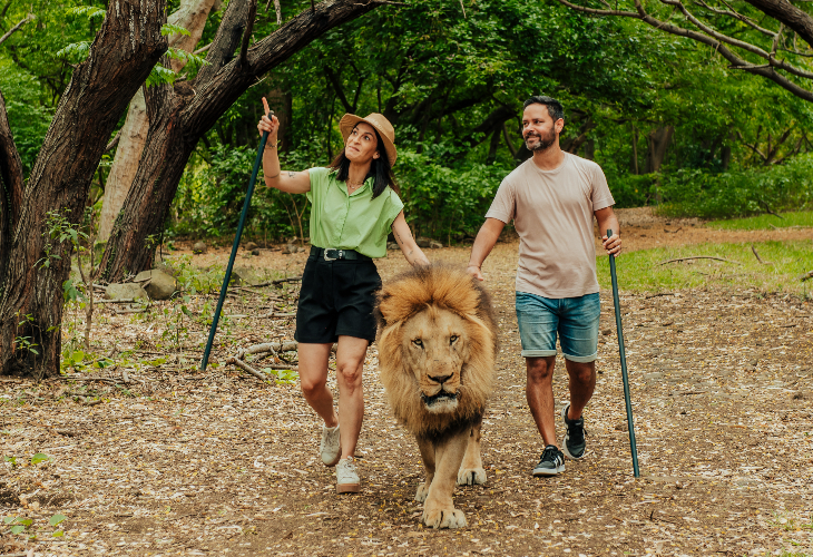 初めにカゼラ ネイチャーパークを訪れ、プロのガイドに同行し、ライオンと一緒に約1.5時間の散歩をするウォークウィズライオンを楽しみます(事前説明、散策、休憩を含む)。