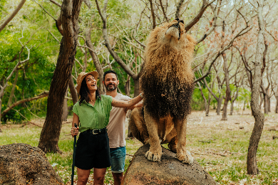 カゼラ・ネイチャーパークでは、ガイド同行のもとライオンと共に歩く迫力の「ウォーク・ウィズ・ライオン」を体験。