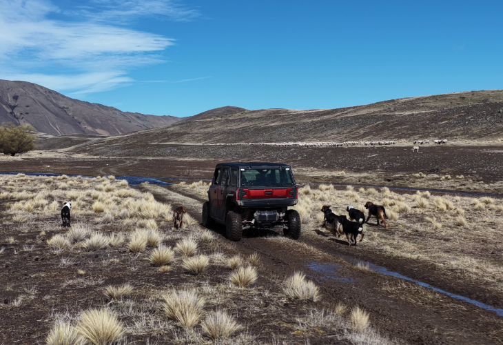 5人乗りATV(四輪バギー)**に乗り込み、最大4名様までの少人数で、熟練の羊飼いと賢い牧羊犬たちと共に牧場の奥深くへと進みます。