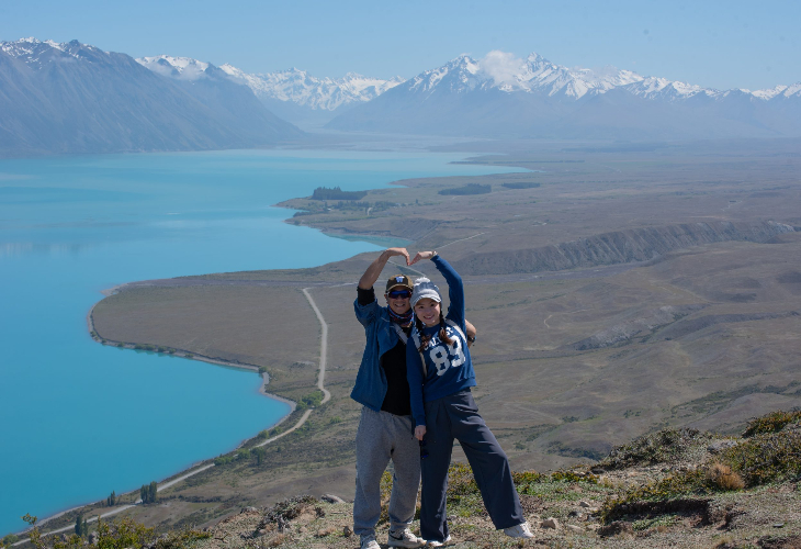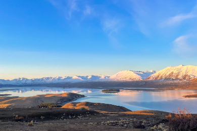 レイク・テカポ東岸の中腹に位置するマウント・アードモアからは、湖とサザンアルプスの壮大な景色が広がります。