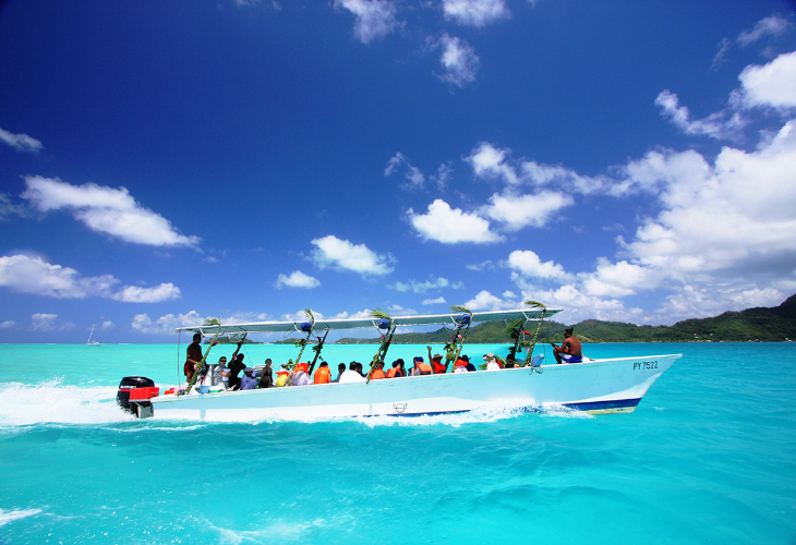 ボートにてボラボラ島ラグーンをクルージング
