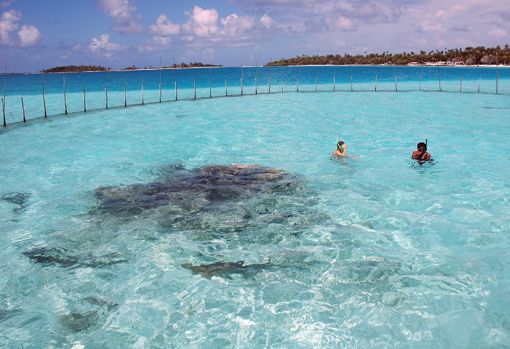 コーラルガーデンでのシュノーケリング、エイの触れ合い体験とサメの見学を楽しんだ後、白砂のモツ(小島)にあるラグナリウム(天然のラグーンを利用した施設)に上陸。魚と一緒に泳げる。バーベキューランチの後はモツでの自由行動。