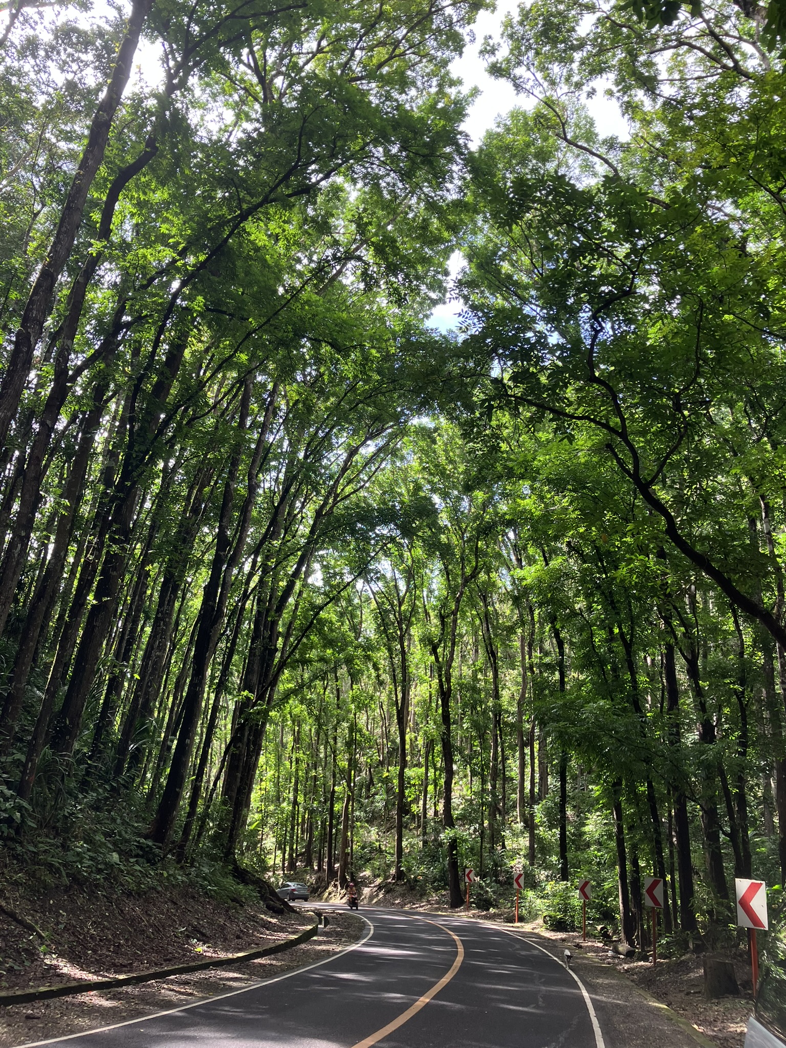 森林再生プロジェクトで植林されたマホガニーの木が密生した2kmに及ぶ人工林はグリーンのアーチのような景観です。