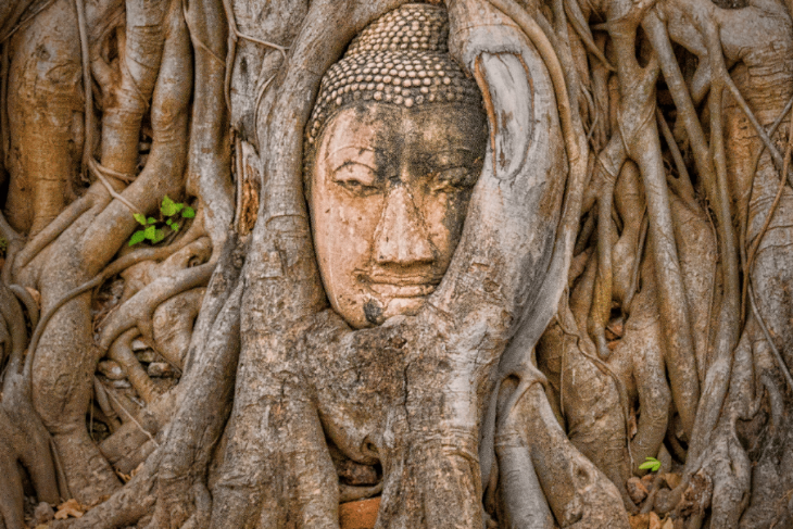 木の根の間に埋め込まれた仏像で有名な寺院。