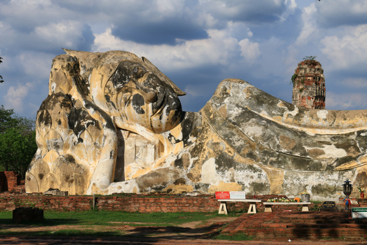 広々とした草原に並ぶ遺跡群の奥にある、全長29mの寝釈迦仏が有名な寺院。中期アユタヤ様式とされるが、現在あるのはタイ芸術局によって復元されたものです。