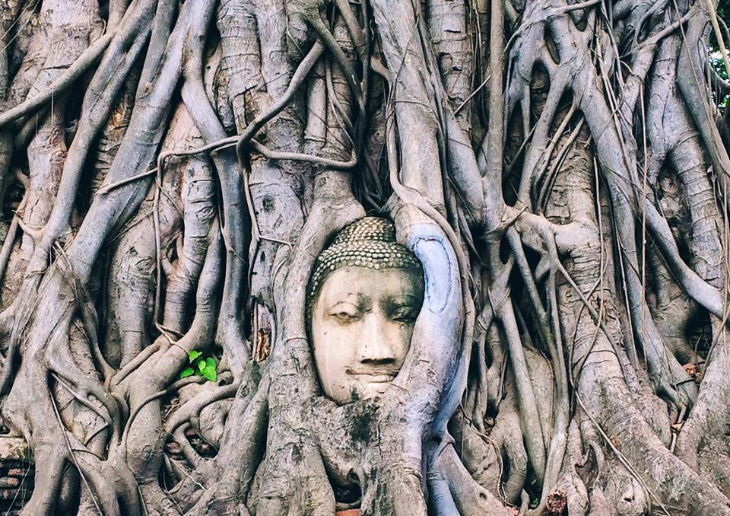 最大の見どころは、木の根に包まれた仏像の頭部。