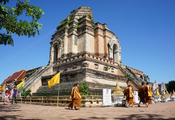 チェンマイで最も大きな(ルアン)仏塔(チェディ)のある寺院。仏塔は、創建当時で高さ約80メートル、四角い形をした基壇の一辺も約60メートルと巨大なもので、チェンマイ市街地の真ん中にそびえ立ちます。