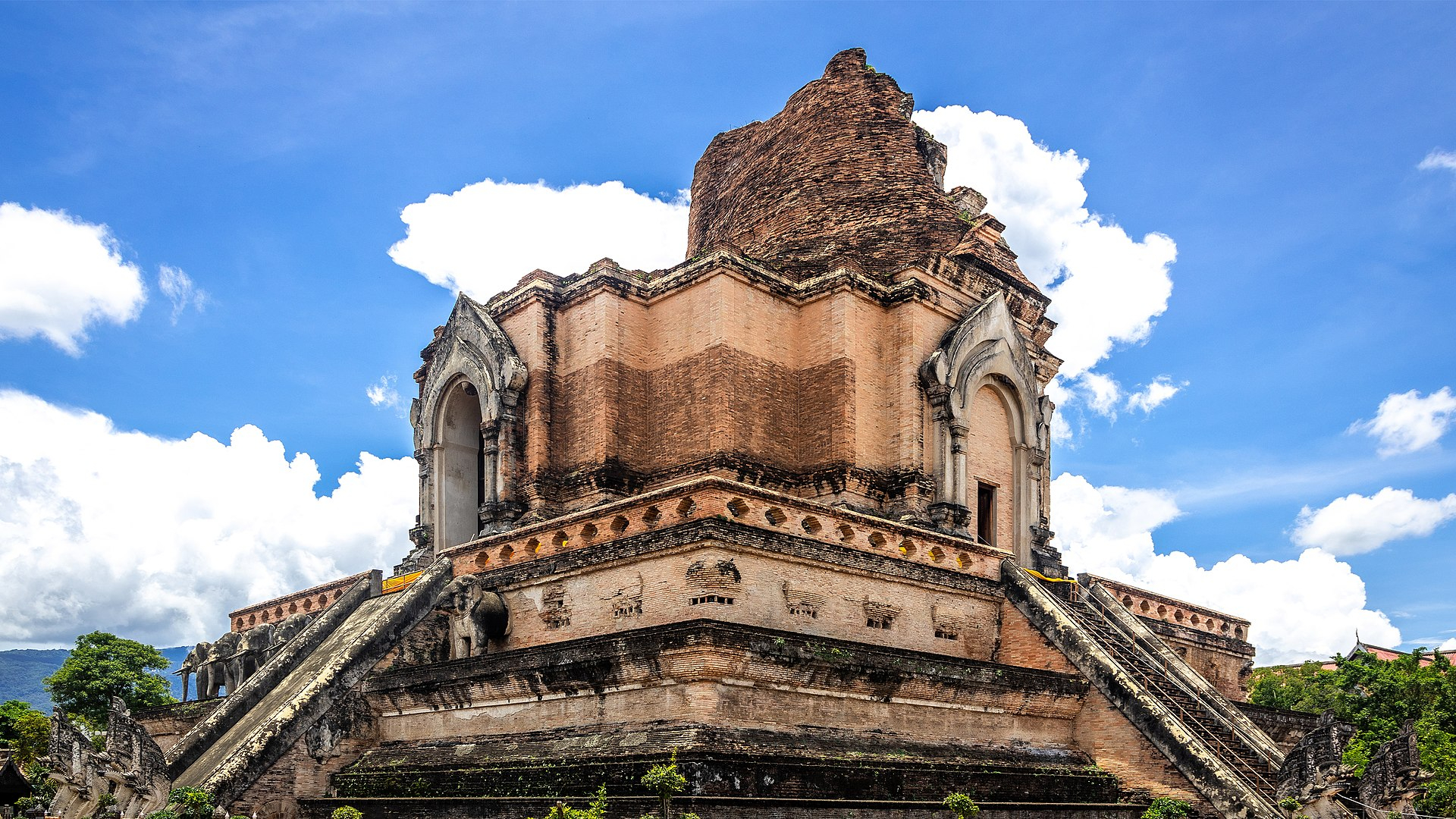 チェンマイで最も大きな(ルアン)仏塔(チェディ)のある寺院。仏塔は、創建当時で高さ約80メートル、四角い形をした基壇の一辺も約60メートルと巨大なもので、チェンマイ市街地の真ん中にそびえ立ちます。