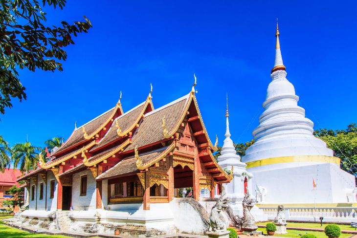 本堂には、ソンクラーン祭りに登場する大理石の仏像「プラ・シーラー・カオ」と水晶の像「プラ・セータン・カマニイー」が安置されています。15頭の象に支えられた仏塔も必見です。