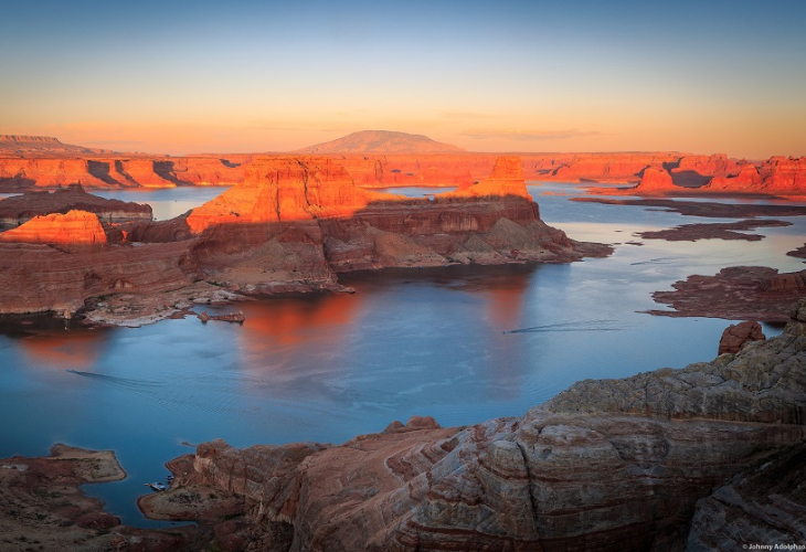 展望ポイントから臨める、湖の青と岩肌の赤の美しいコントラストは、 他のグランドサークルのポイントとは異なった雰囲気の絶景として人気を博しています。
