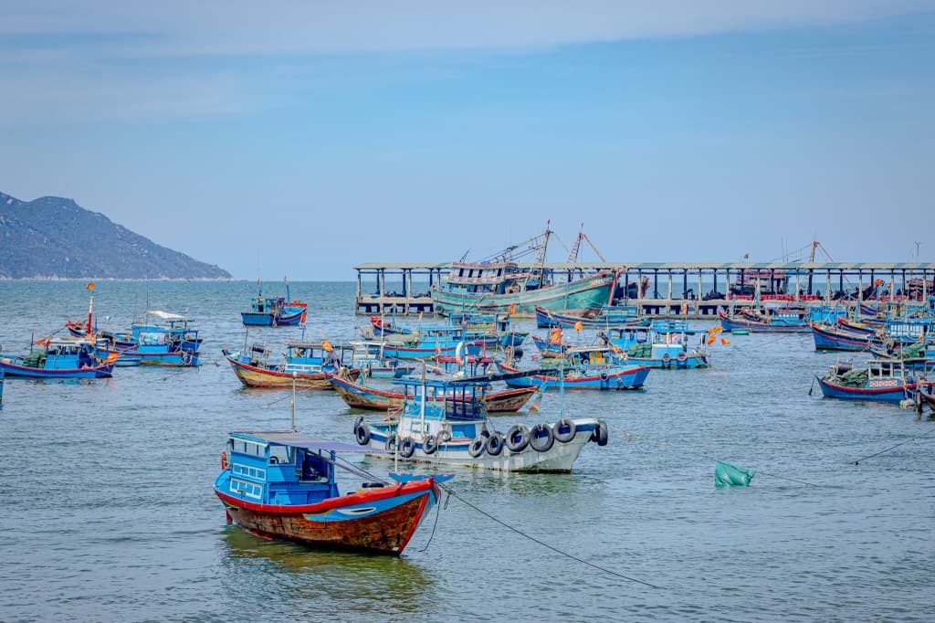 波の入らない静かな入り江に漁船がびっしり!漁業が盛んなベトナムならではの海岸沿いの風景です。