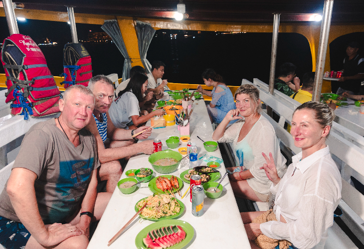 ドゥオン・ドン中心エリアでの無料送迎、クルーズ、英語ガイド、500mlミネラルウォーター1本、旅行保険(事故補償上限3,000万VND)、船上でのレクリエーション用イカ釣り道具:釣竿、餌など、夕食