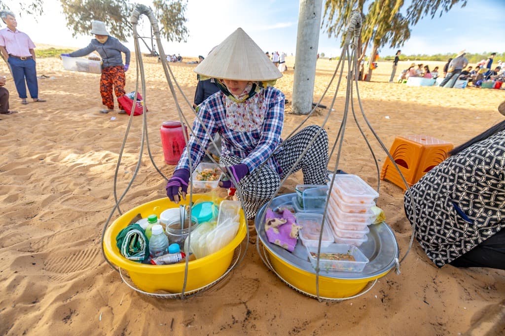 砂丘の入り口にたくさんいるグルメベンダー。エビとタピオカ生地を使ったバインボットロックや温豆腐のスイーツ、ココナッツ風味の煎餅などムイネーの名物を売ってます。