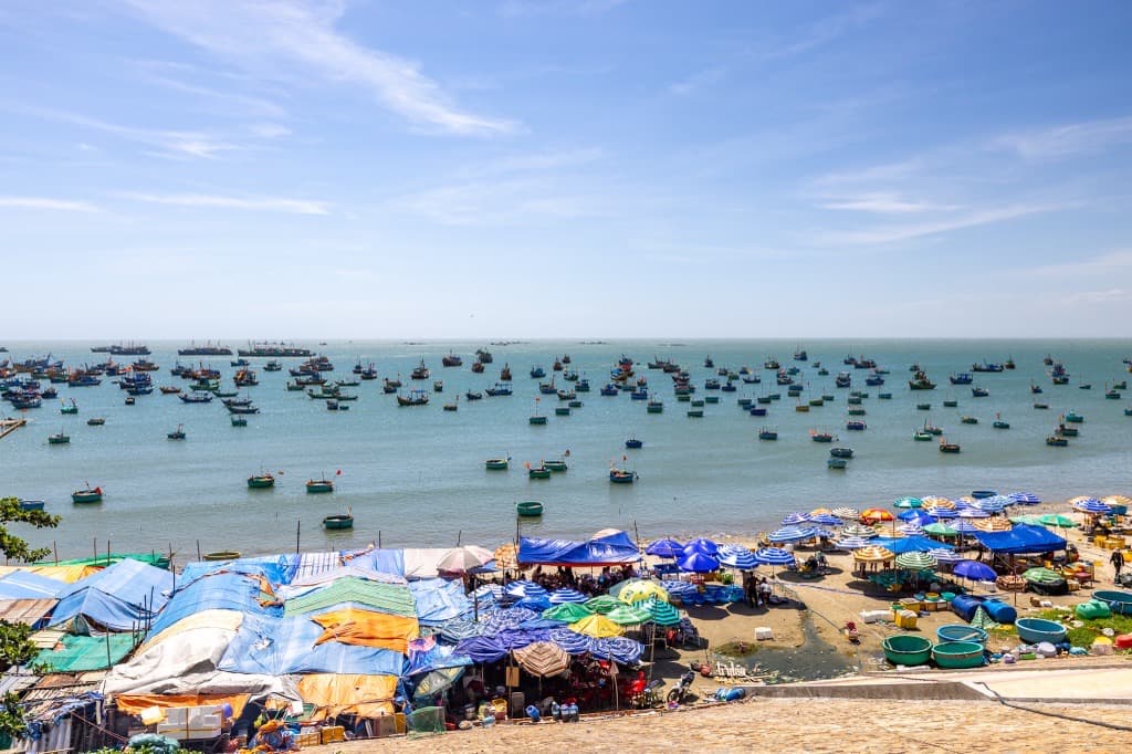 ムイネー岬の陰になった海岸エリアには漁船やお椀ボートがびっしり停泊し、ビーチでは水揚げされたばかりのシーフードが簡易生け簀で売られています。圧巻のベトナム漁村へご案内いたします。